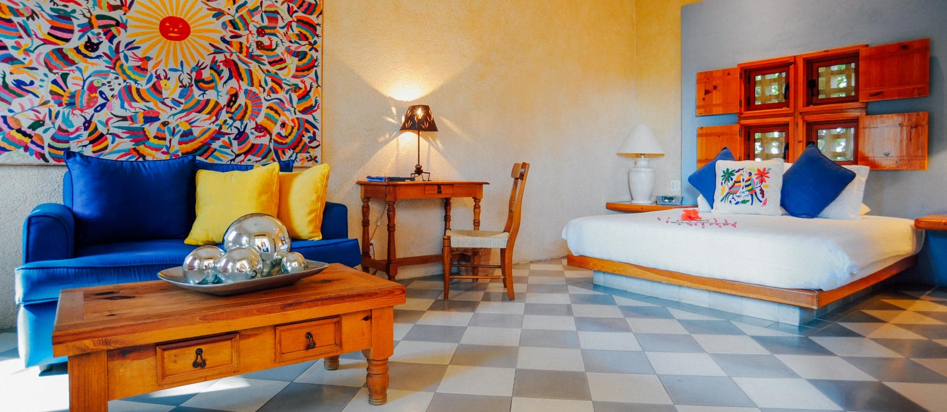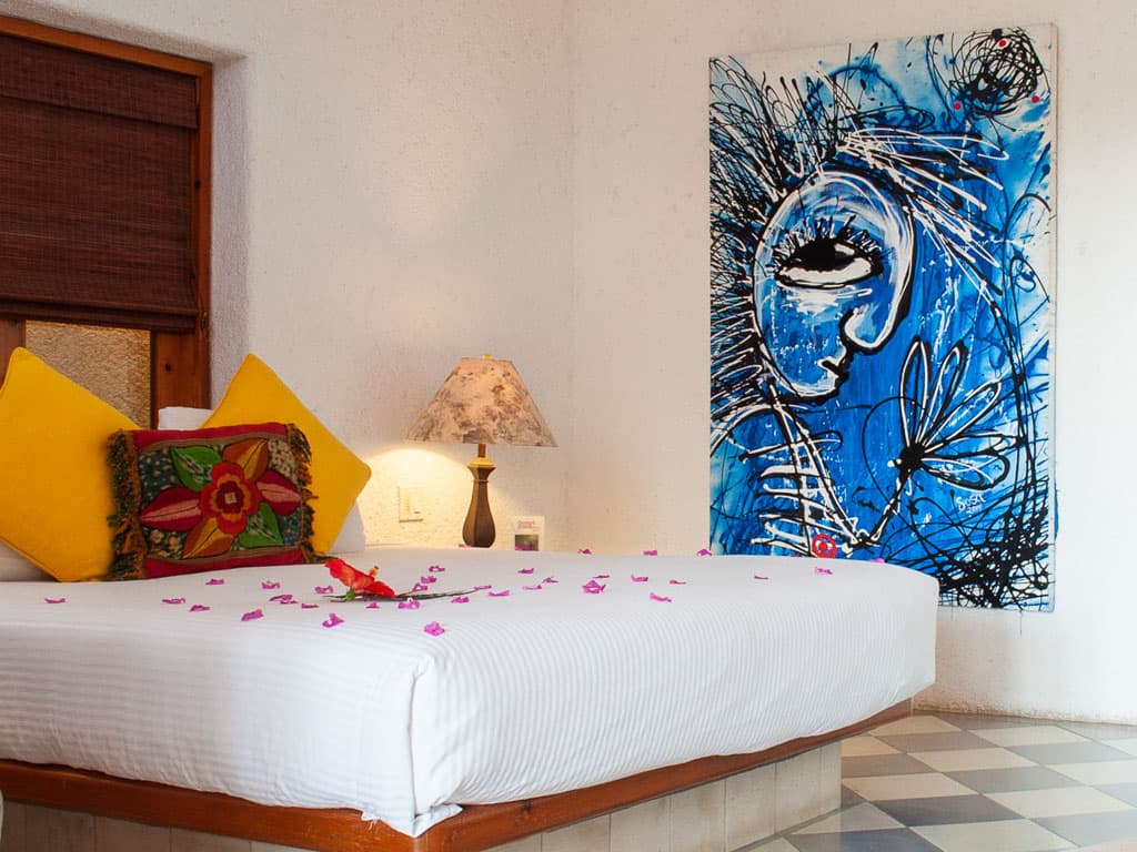Decorated by a popular artist located here in San Jose del Cabo, Casa Natalia's popular Arte Room features unique pieces of local artwork, a comfortable king bed and a large terrace with seating and beautiful resort views. The large marble bathroom features a spacious walk-in shower.